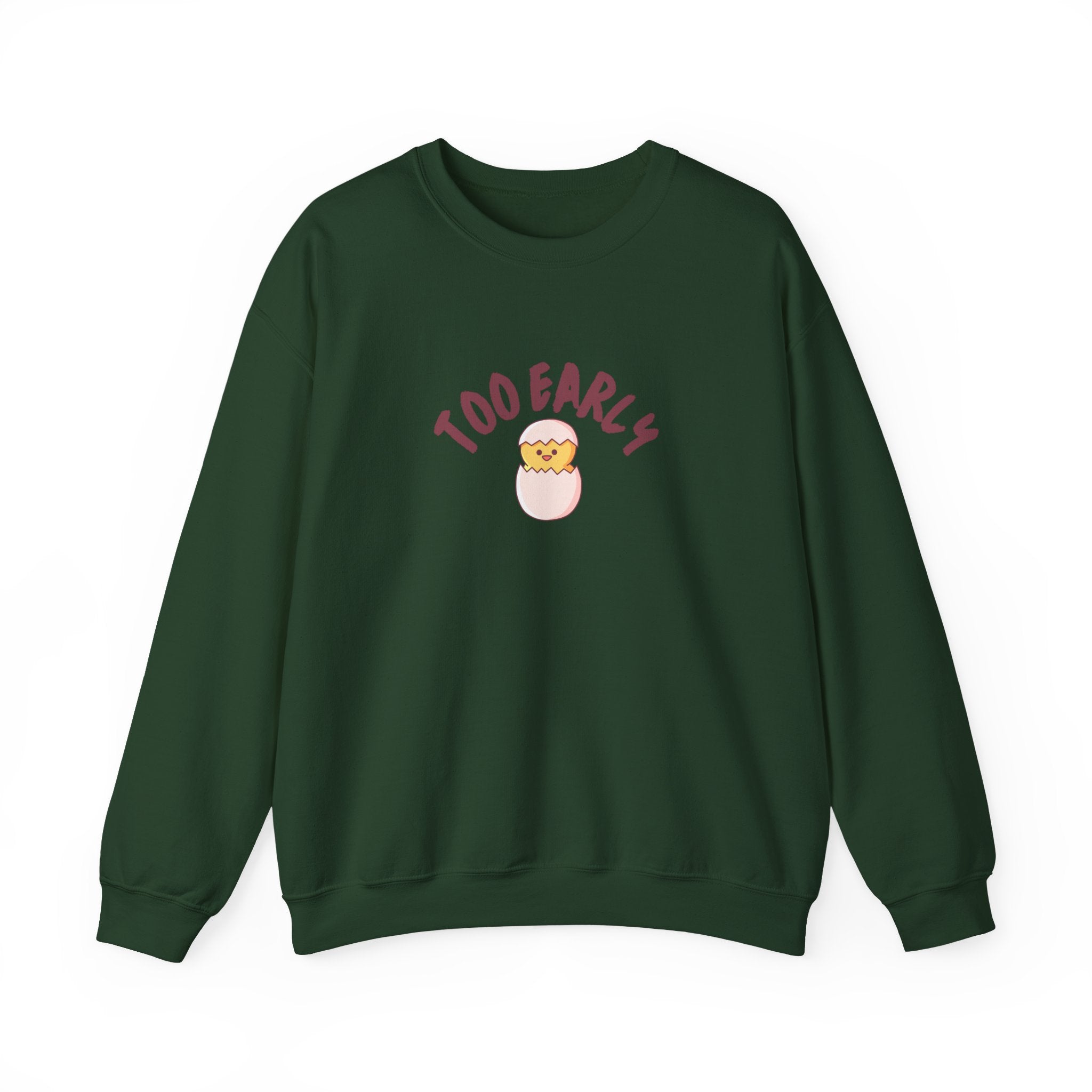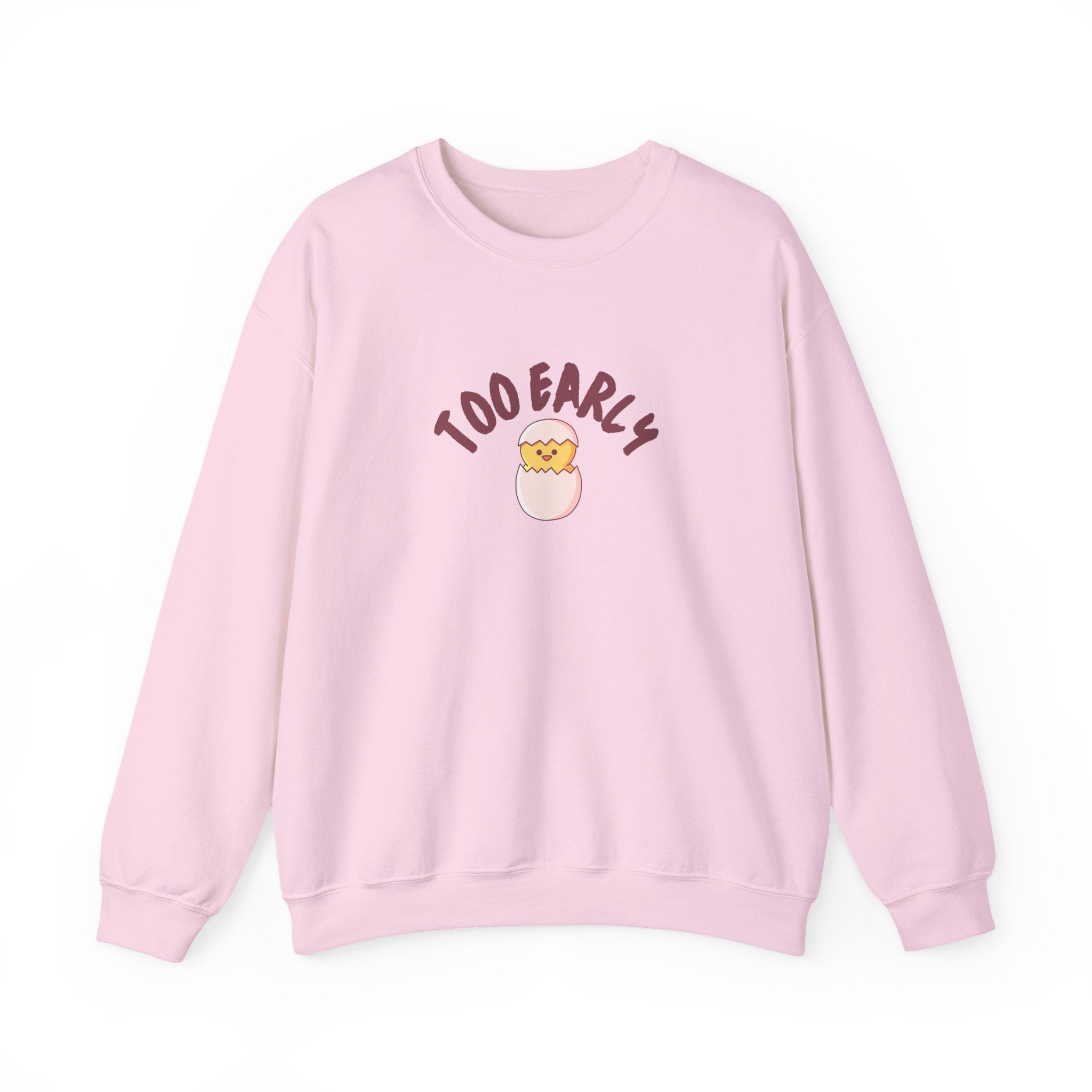 Soft, cozy, and quietly funny — this crewneck wraps you in warmth and a gentle laugh. The simple off-white sweatshirt features a small, centered illustration of a sleepy chick popping from an egg with the curved caption “TOO EARLY” above it. Lightweight enough for layering, yet substantial in feel, the sweatshirt brings everyday comfort with a touch of playful personality that slips easily into mornings at home, slow coffee runs, or relaxed weekend errands. The clean silhouette keeps the design the focus, while durable stitching and quality fabric mean it will become a go-to for low-key days and early starts.